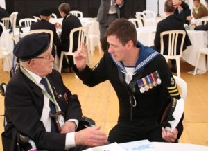 At this point Dennis and Douglas were joined by Douglas’s wife Helen and their daughter Emma, which was a great bonus for Dennis. The family were able to enjoy together the speeches, music, other entertainment and the Red Arrows fly-past which Dennis reported as being very impressive. After this they were escorted into a large marquee for refreshments. Here Dennis came across three naval officers, whom he saluted smartly. ‘You’ve not forgotten then!’ joked one of the officers!