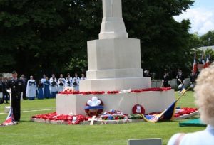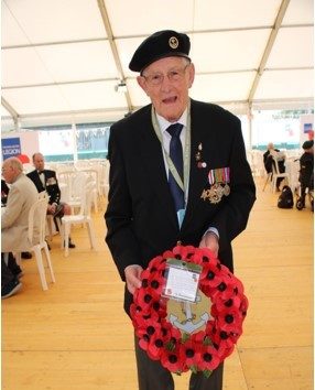 Dennis and other veterans were wheeled into a giant marquee where a service was held around the war memorial. As many of you will know, this event was attended by Prince Charles, The Duchess of Cornwall, the Prime Minister and President Trump as well as President Macron and other important people. Moving speeches were made commemorating the many soldiers who had died during the Normandy landings during this hugely important campaign of WW2. Dennis was one of the ex servicemen who were given the privilege of laying a wreath at the memorial. Music throughout the day was supplied by various military bands.