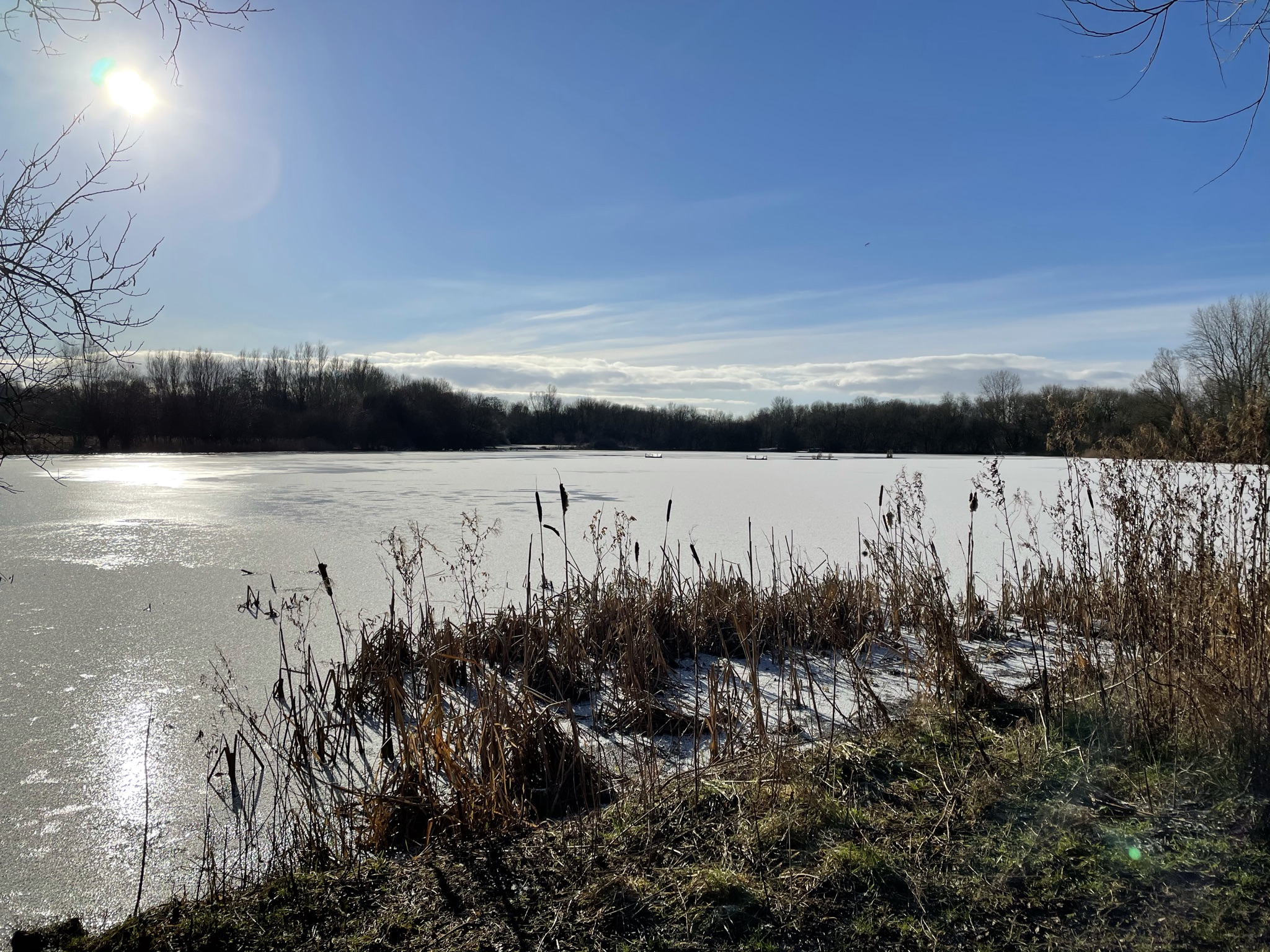 I live fairly near the park, so I walked up Wanlip Road and went into the park by the canal path. By the side of the canal a heron stood against the bushes, looking slightly ‘hunched up’ which they usually do, but I couldn’t help wondering if the pose was due to the cold! As I walked into the car park the partly frozen lake glittered in the bright sunshine. I could have stood there admiring it for a long time, but feeling in need of exercise, I followed the path round the edge of the lake, catching glimpses of areas of frozen marshland looking strangely flat with a light dusting of snow on the icy surface. The willow trees were starting to show some colour and it was all so gorgeously picturesque that I felt as if I had been transported to a magic kingdom.