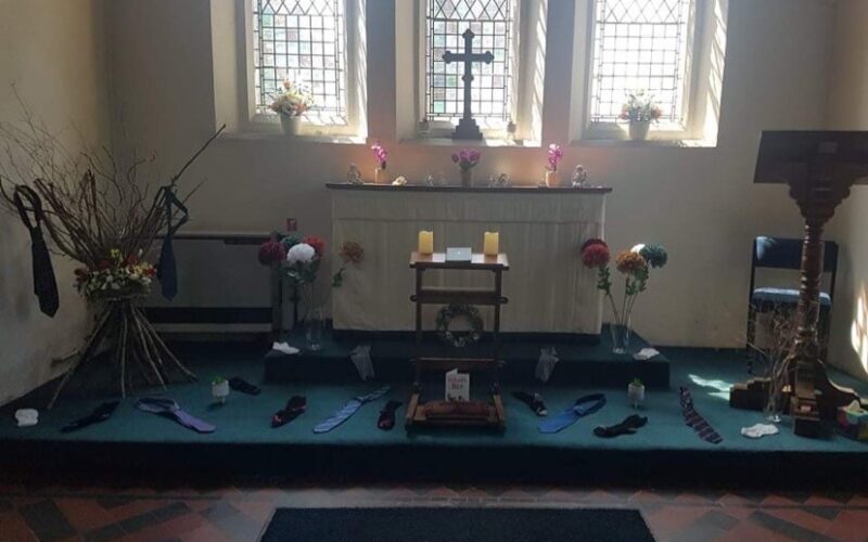 A Father’s Day display, pictured above, has been done featuring ties and socks, things fathers always get, and a summer display has been arranged by myself around the altar.