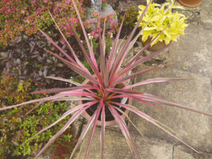 Two years ago I purchased Cordyline ‘Torbay Dazzler’ which has burgundy and pink sword shaped leaves, but since then I have found its true name is ‘Pink Sensation’, pictured left. I took this for Mitch in its original container to stand in his garden.