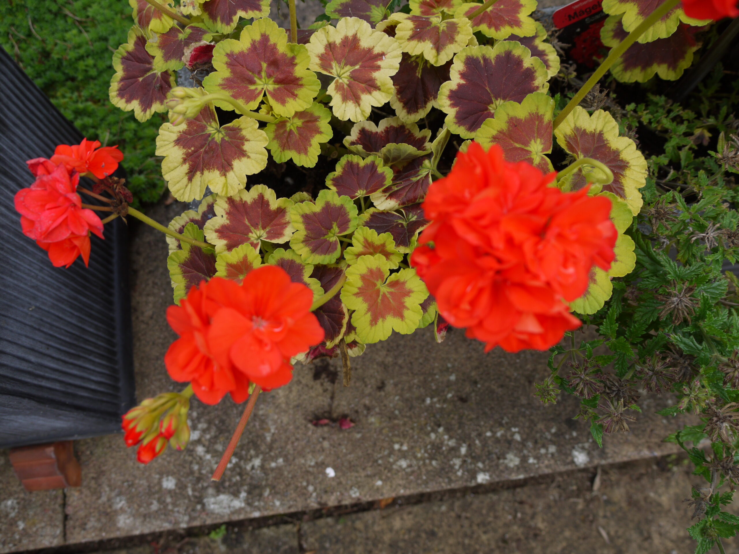 On my patio there are two troughs containing a beautiful yellow variegated Pelargonium (geranium), pictured left, that since June has given me a colourful display not only for its foliage, but also for its bright orange-red contrasting flowers, which if the weather holds out, will still be in flower during late October. Then they will go into my greenhouse to overwinter.