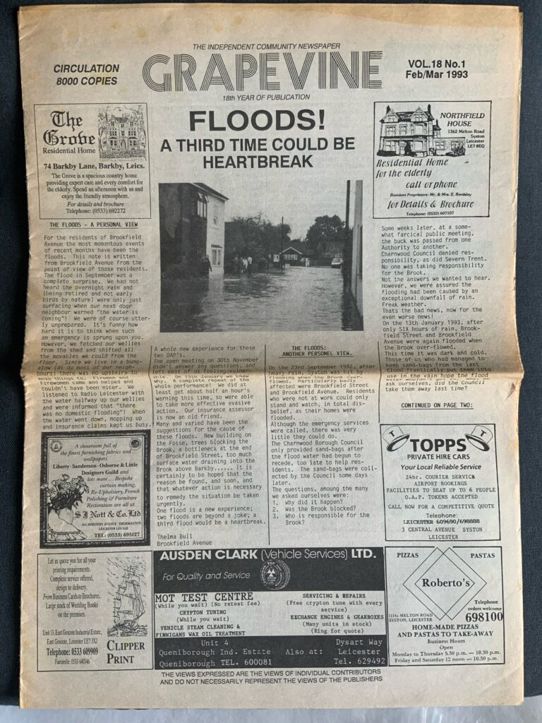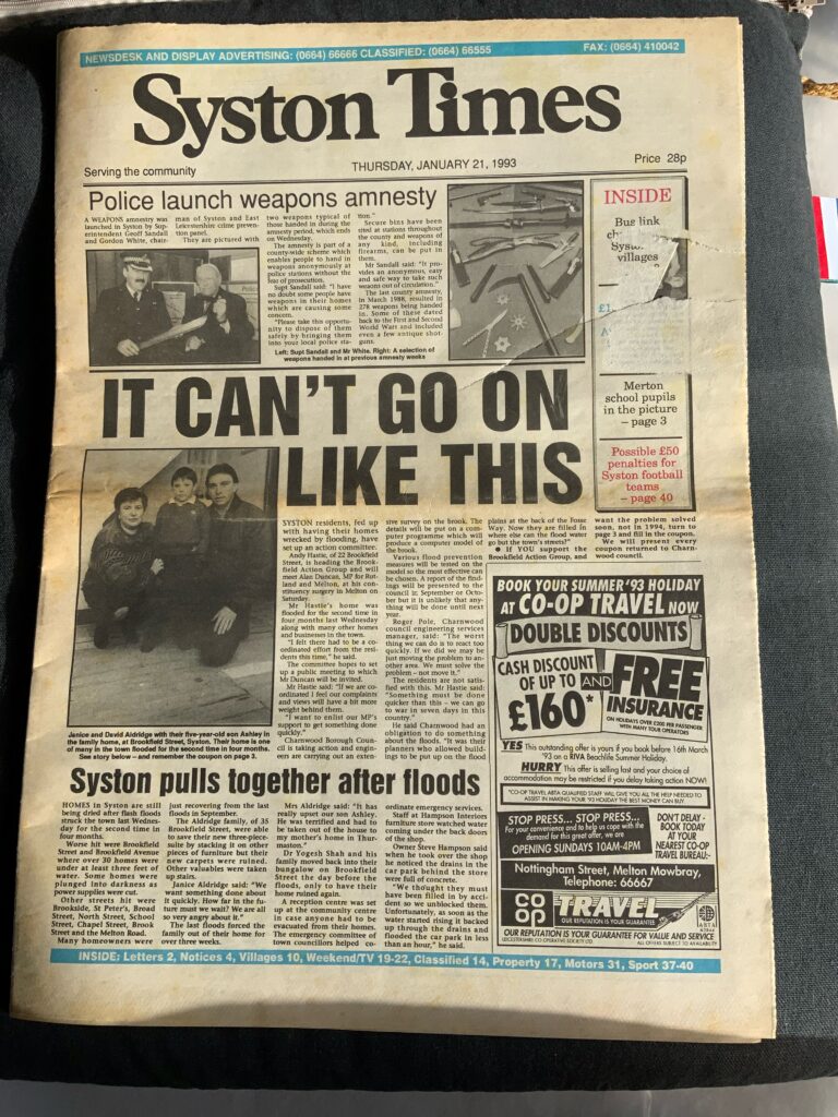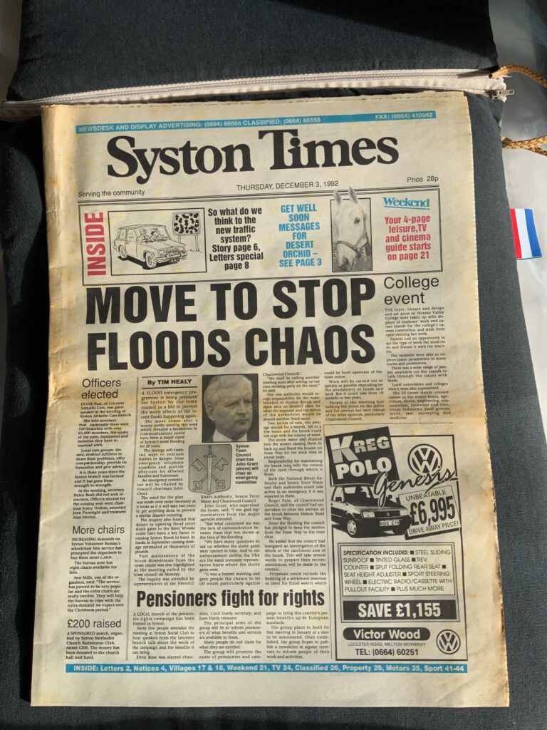 The gallery below shows photographs that have been sent in by residents affected by the floods, both businesses and residential properties were flooded on 20th October. The pictures of the Melton Road car park were taken by Syston Town News. We would like to thank everyone who got in touch. The images of the newspapers from 1992 and 1993 are also shown below, plus the report mentioned in this article.