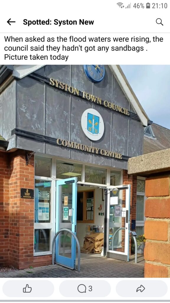 Why hasn’t this been adhered to, is another question for not just Syston Town Council, but also the Borough and County Councils as it was a joint collaboration to prevent floods that happened in October from ever happening again!