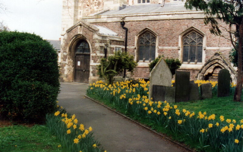 How wonderful the pathway to the church with the daffodils in full flower.