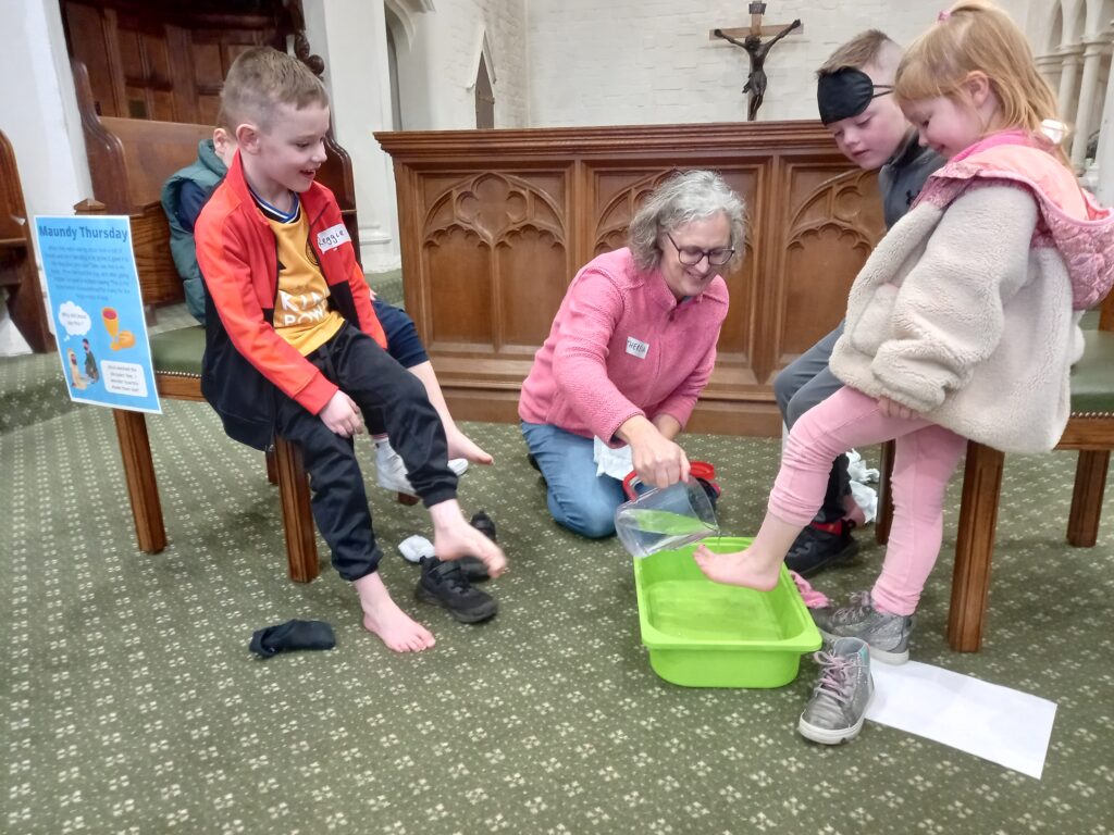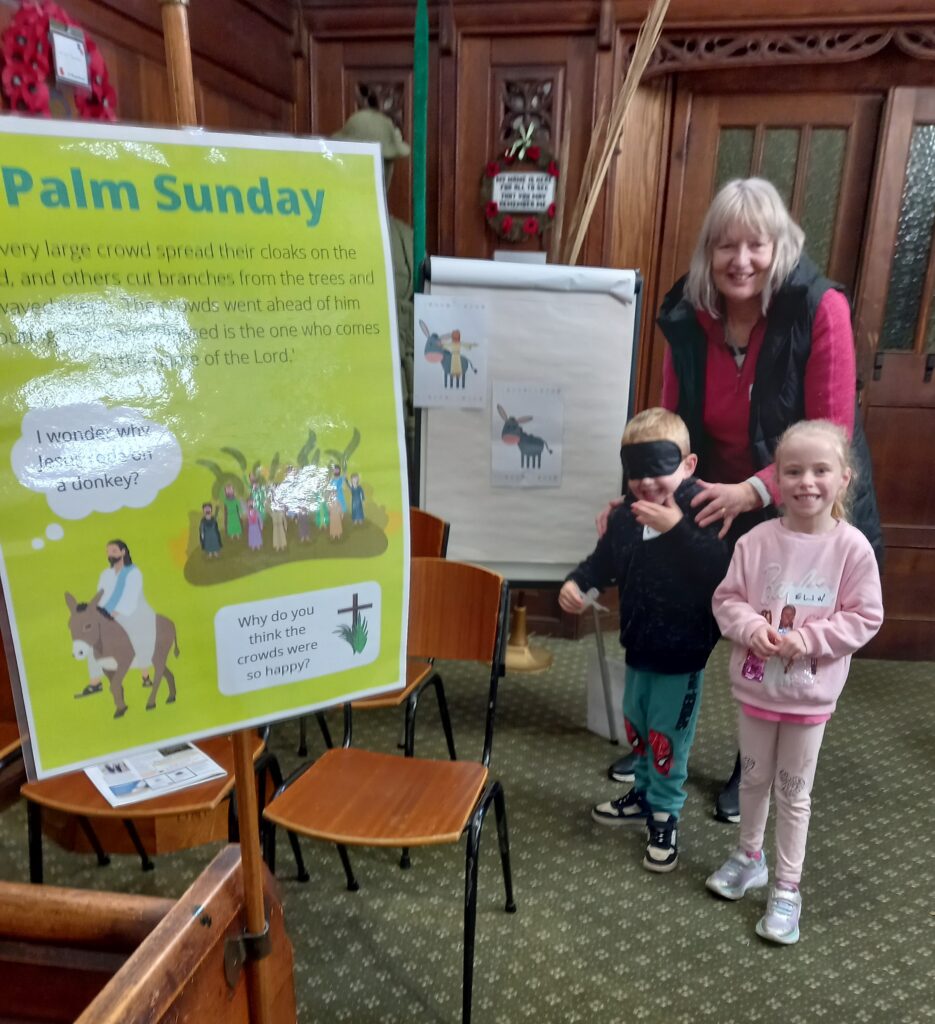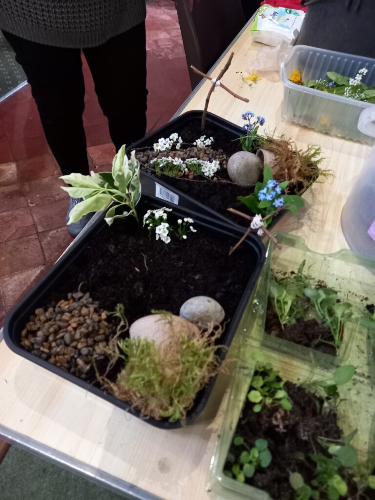 On Good Friday from 10am till 12noon we had the church open for families to come and follow the Holy Week events. The first activity was to be blindfolded and try to put Jesus on his donkey! Other activities included reflecting on ‘Spy Wednesday’ by coin rubbing, enacting Jesus washing the disciples’ feet and colouring a stained glass window. The final activities engaged families in creating an Easter garden, pictured above right, to take home and an Easter trail around the church..